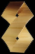 Once again, I rushed to tape the pieces together to see if it would work, and once again something was wrong. The corners seemed to be more or less 60°, but the top piece of the top quarter cone was not parallel to the bottom piece of the bottom quarter cone (nor was it perpendicular to the table) and so there would definitely be at least a mismatch with the straight sections on the sides. There was still almost a week before Roger returned so, before starting to cut a third pile of wood, I decided to look for yet another substitute sculpture to assemble from some of the pile of incorrectly cut pieces. This sculpture used 114 pieces and the end result is called Medici, in my opinion one of my most successful pieces ever.