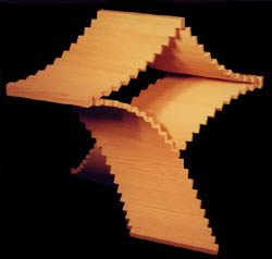 A consistent aspect of Eli Wakan's cone, helix and cylindrical designs is his emphasis on elements: the repetition of wedges in forms of six squares, 44 pieces of 9" B. C. hemlock, with edges bevelled at four degrees. The idea for this came about during The Red Gate Gallery's first exhibition, with the sculptor having on hand five or six wood sculptures which required labels. `Necessity being the mother of invention', I designed terraced rectangular, truncated pyramids as label bases. And, while I was playing with the pieces, and exploring their various possible juxtapositions, I was curious about the look of a more cubic form. I did some calculations, and adjusted the table saw, and other geometric forms evolved.